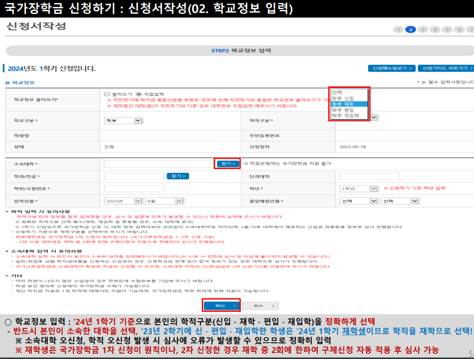 장학금 신청버튼을 누르면 아래 이미지 처럼 뜨는 정보입력란을 다 읽고 정보들을 빠짐없이 작성해야 합니다.