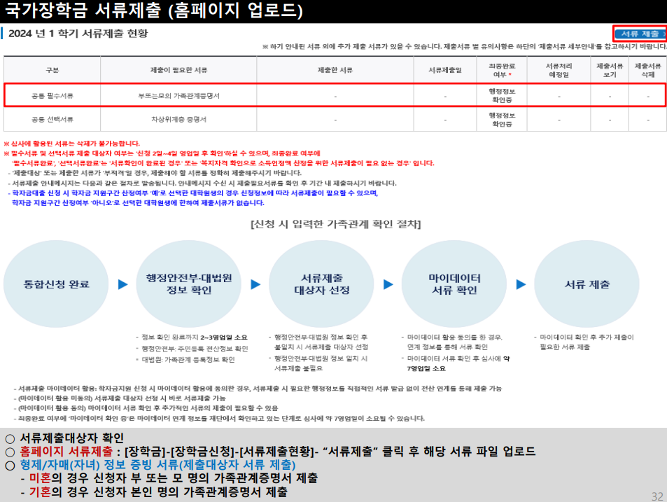 위의 신청 완료후 필요한 서류는 가족관계 증명서, 차상위/기초생활 수급자 증명서 (차상위/기초생활 수급자일경우에 필요) 가 필요합니다.