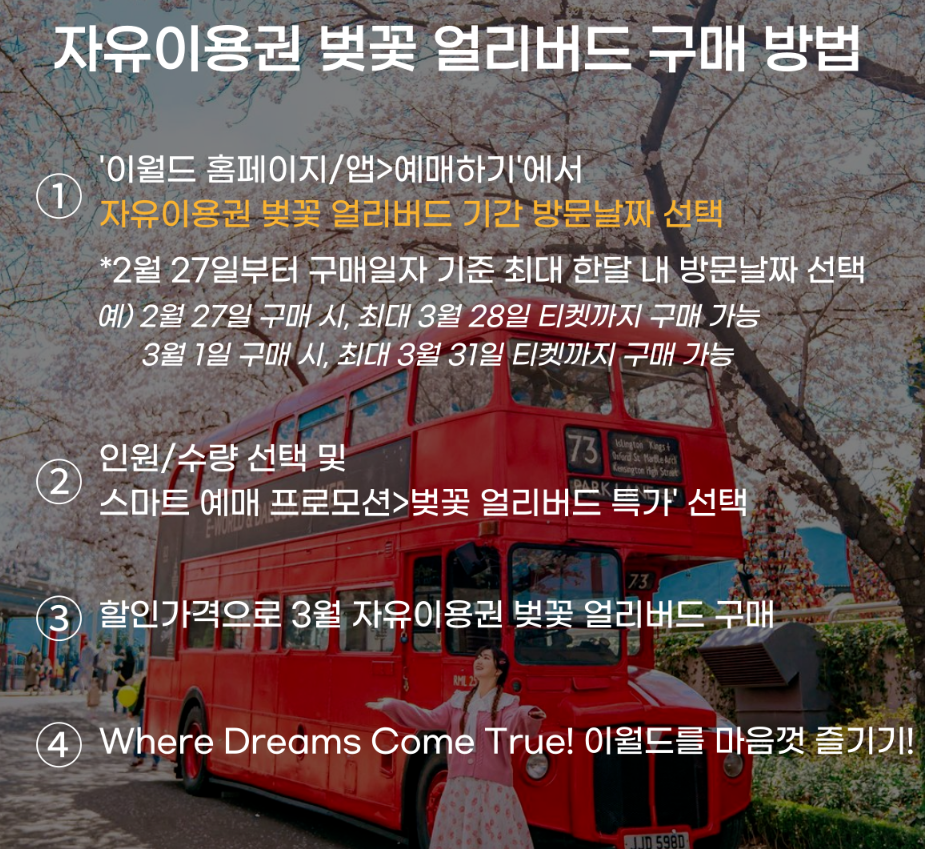벚꽃시즌을 맞이하여, 3월 10일까지 미리 예매하시는 분들은 저렴한 가격으로 이용하실 수 있으니 생각이 있으신 분들은 얼른 예약을 하고 날짜에 맞추어 놀러 가시는 것을 추천드립니다.