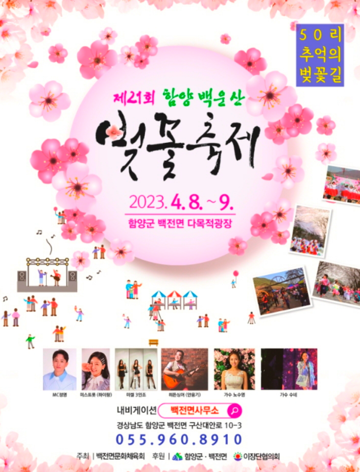 벚꽃축제가 열리는 장소는 함양 읍내에서 시작해서 병곡면 지나 백전면 백운마을까지 이어지는 50리 벚꽃길로 여러 초청가수 공연과 민속놀이 및 노래자랑 등 다양한 참여 프로그램이 마련되어 있는 축제입니다.