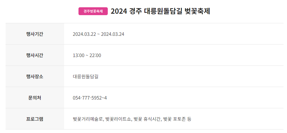 대릉원 돌담길은 경주의 아름다운 길이라고 합니다. 벚꽃들과 함께 벚꽃과 어울리는 다양한 볼거리, 먹거리, 즐길거리등이 마련되어 있는 벚꽃축제입니다. 경주는 다른 문화유산들로 유명한 곳이니 많은 분들이 이미 한 번쯤은 가보았다는 생각이 듭니다. 하지만 그리 자주 가지 않는 곳이니 만큼 이번에 경주로 놀러 가서 벚꽃을 즐기며, 야간구경도 하는 즐거움이 생길 것이라는 생각입니다. 계다가 대구와도 무척 가까우니 추천드리는 장소입니다.