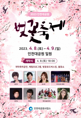 인천대공원은 연간 400만 명의 시민들이 찾는 수도권의 대표적인 공원입니다. 또한 누구나 맑은 공기를 마음껏 마실 수 있는 휴식공간입니다. 그리고 자연을 만끽할 수 있는 즐거움과 여유롭게 힐링할 수 있는 휴양공원입니다. 그곳에서 벚꽃 축제를 엽니다. 작년에도 열었으며, 개막공연, 체험프로그램, 불꽃쇼 등을 관람하고 구경하실 수 있습니다.