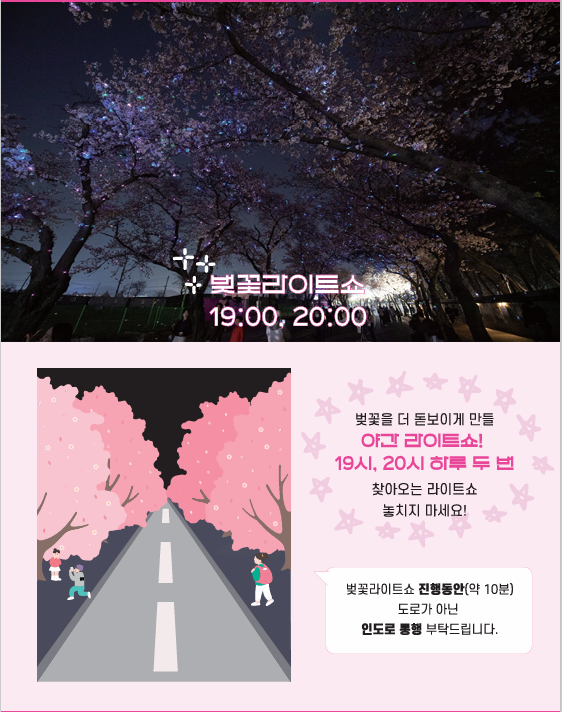 이번 축제에서는 저녁 7시, 8시 2번 벚꽃라이트쇼를 한다고 합니다. 야간의 벚꽃 불빛 구경을 하고 싶은 분들은 시간을 참고하시어 즐겨보시길 바랍니다.