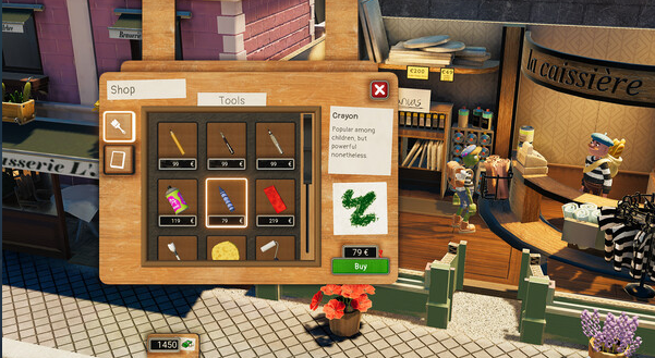 파스파투는 마을에 도착하게 되는데 그곳은 피닉스라고 불리는 마을이었습니다. 거기서 접이식 이젤 즉 폴더블 이젤을 사용해서 외출한 장소에서 그림을 그려 팔게 됩니다. 주민들에게 미션과 의뢰를 받아서 그림을 그려주고 보상을 얻게 됩니다. 업데이트가 된 점은 그림도구에 색이 더욱 추가가 되었으며, 도구기능 또한 늘어났습니다. 다만 전작은 도구를 구매하지는 않았는데 이번작에서는 미술 용품 상점에서 물건을 구매하게 됩니다. 캠퍼스 또한 다양한 모양이 존재합니다.