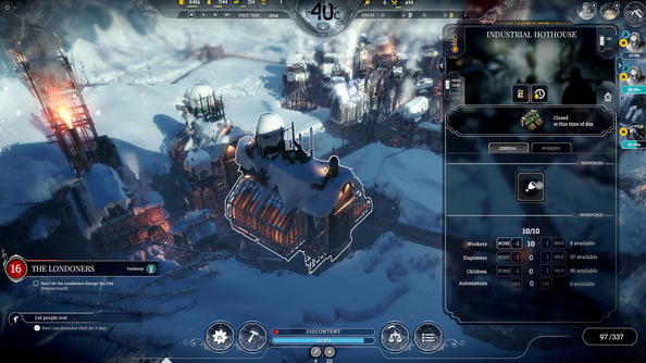 처음 플레이를 하면 주인공이자 플레이어는 난민으로, 런던을 탈출하고 북극에 새로운 도시를 건설해 나가기 시작합니다. 두 번째 시나리오를 플레이하면 옥스브리지들의 학자들이 식물 씨앗을 지키기 위해 노력해야 하며, 세 번째 시나리오는 원래 귀족들을 위해 준비된 장소에 일반 피난민들이 몰려오고, 뒤늦게 귀족들이 찾아와 벌어지는 계급 갈등을 해결해야 하는 시나리오입니다.. 그다음 시나리오 윈터홈의 몰락은 이제 수명이 멀지 않은 발전기를 버리고 탈출하기 위해 노력하는 시나리오를 가지고 있습니다.
