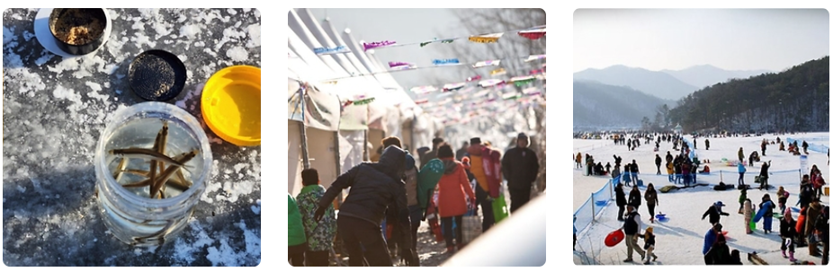 겨울에 얼음판 위에서 빙어 낚시를 경험할 수 있는 빙어 낚시 축제입니다.