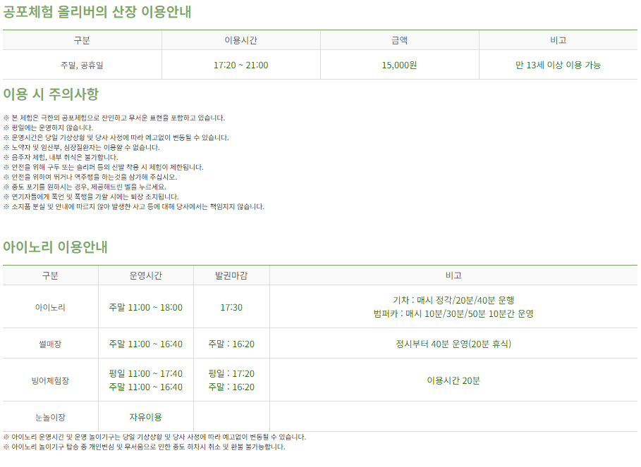 눈썰매 및 놀이시설: 오전 11시에서 오후 4시 20분까지 자세한 내용은 아래를 참고 부탁드립니다.